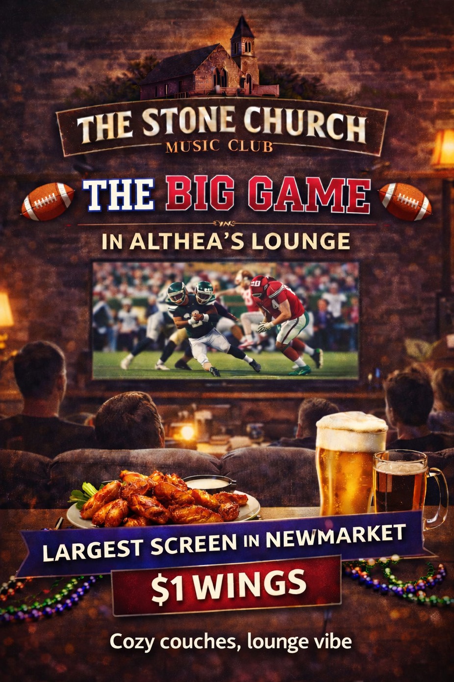 Settle into cozy couches with a true lounge vibe for The Big Game at The Stone Church Music Club! We’ve got Newmarket’s largest screen, $1 wings, cold drinks, and all the energy you need for the biggest match-up of the year (without saying the name 😉). Whether you’re a die-hard fan or just here for the snacks, this is the place to watch it go down.