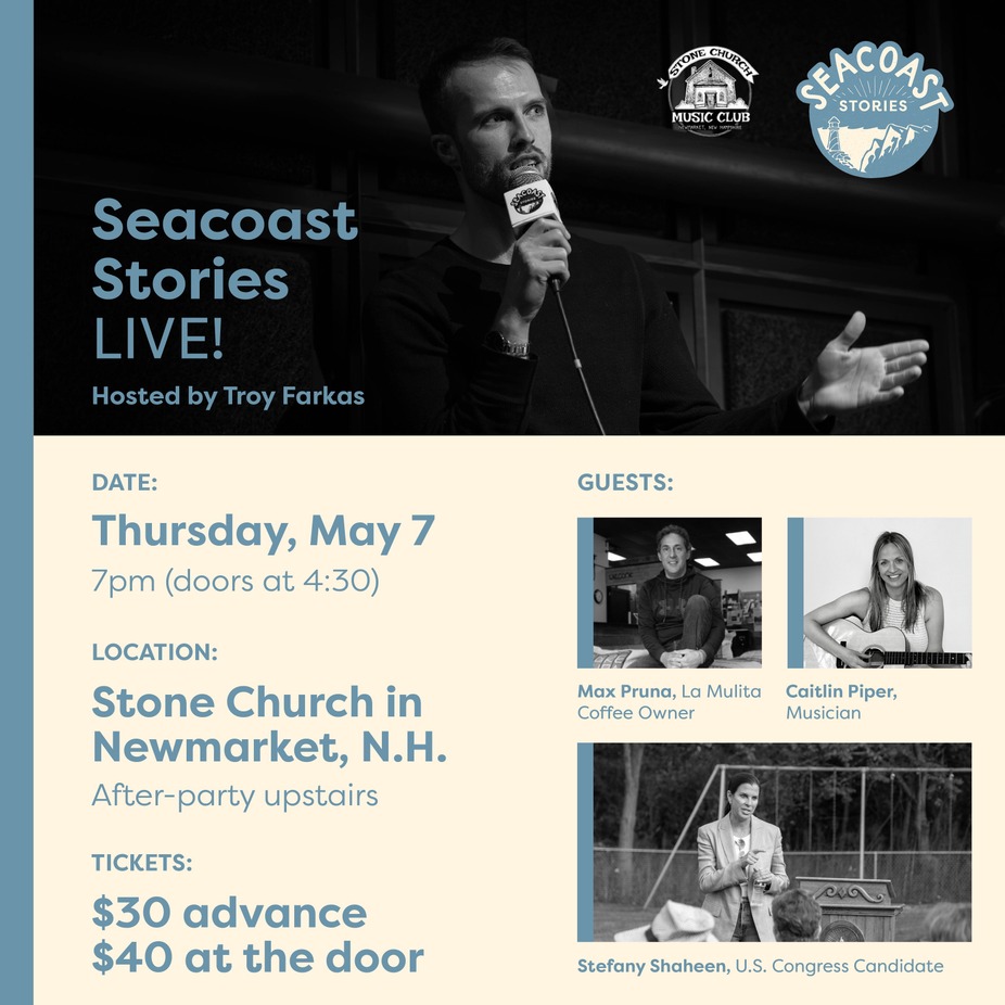 In the first EVER live podcast hosted at Stone Church, Farkas will speak to popular past guest Max Pruna, the beloved owner of La Mulita Coffee in Rye, N.H. After that, musician Caitlin Piper takes the stage with her acoustic guitar to play some of her original music. And in the headlining act, New Hampshire royalty! Few people understand the Seacoast more than Stefany Shaheen, and the two will have an engaging discussion about her love for the Seacoast, the local issues she's most passionate about, and why she's running for New Hampshire's 1st seat in U.S. Congress this fall.