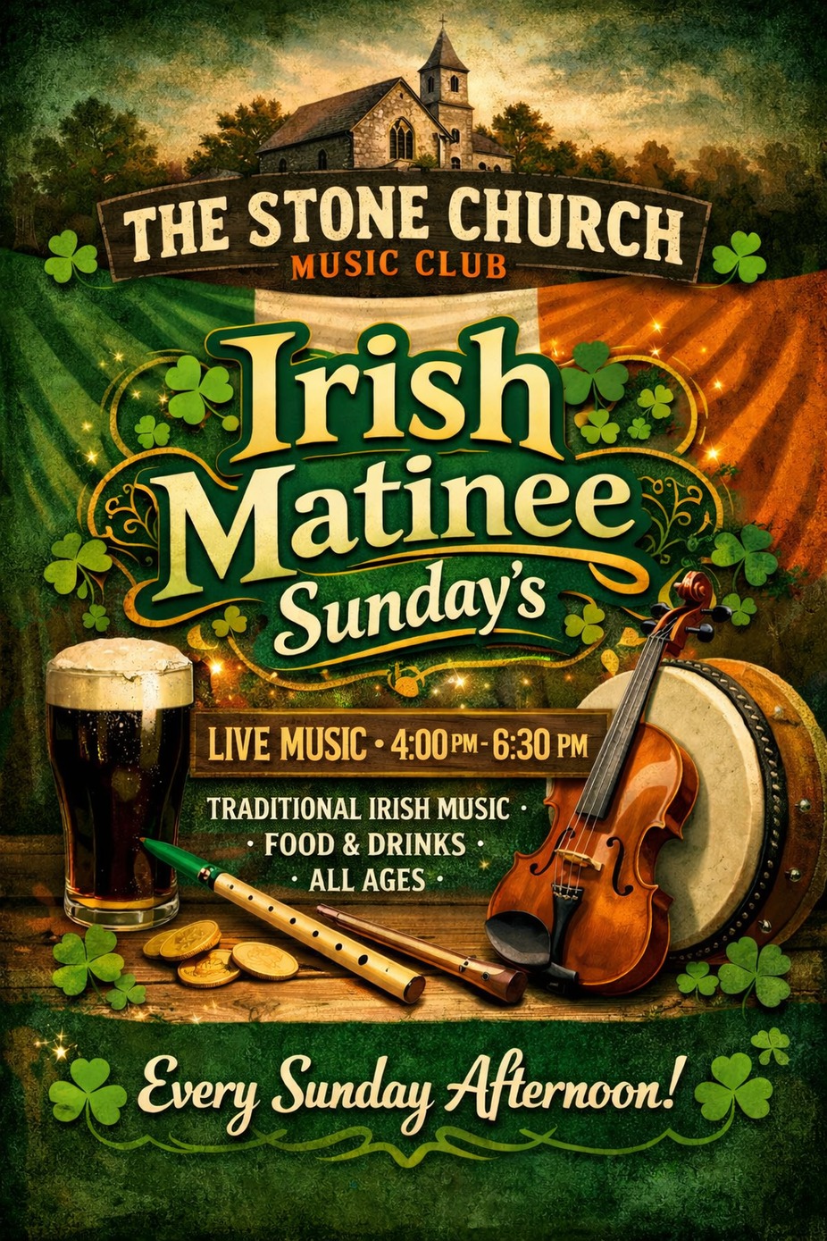 Ease into your Sunday with the sounds of traditional Irish music, cold pints, and warm community vibes at The Stone Church Music Club. Jim & Jordan bring spirited tunes, timeless melodies, and just the right amount of foot-stomping joy for a perfect late-afternoon hang.